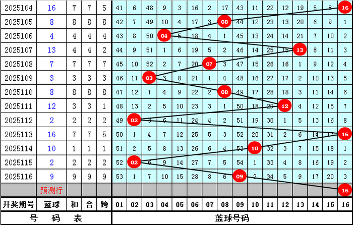 蓝球余数分析:最近7周日曜日开出5个蓝球余数,重叠蓝球余数显著活跃,本周日曜日抹杀近期已出现的蓝球余数,防备温冷蓝球余数回补,照料蓝球16。