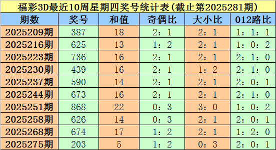 福彩3D第2025275期(上周星期四)奖号为203。其中奖号奇偶比为1:2,大小比为0:3,012路比为2:0:1。